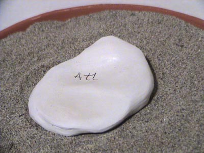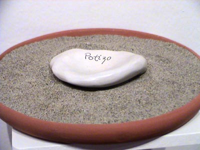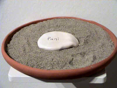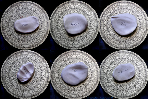 25 pieces: clay plates, sea sand and burnished ceramics with the word WATER written in 25 different languages