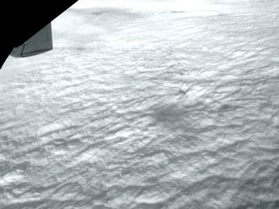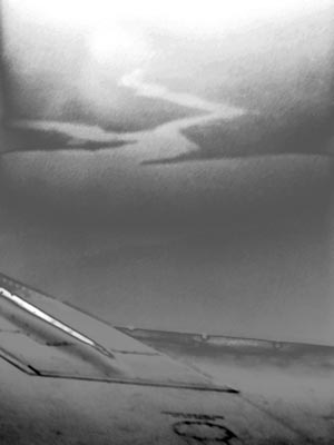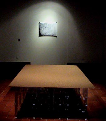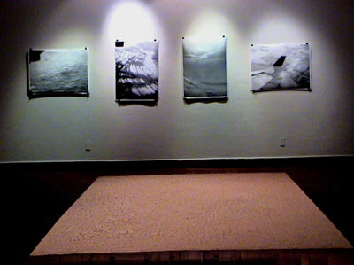 Fotos de la Instalación tomadas de un video. Voces grabadas durante la travesía, música de Amadís Ross. Track original: 15.00', tocada continuamente durante la exhibición. Aire se inauguró junto a Agua el 12 de enero del 2004 en el Centro Cultural Universitario. |