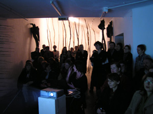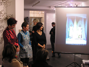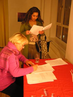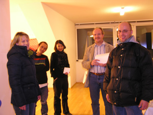 Vemos al jefe Hartwig y a Lee Kuang cargando las escaleras que nos sirvieron para llegar a lo más alto posible del kastanienbaum. La noche se acerca. (Y se podrá encontrar informacion más puntual sobre unter rot en su lugar correspondiente dentro de este ciber espacio, a su debido tiempo). Me preparo para presentar i d e n t i d a d e s en la Literaturhaus y es también un éxito, aunque nadie haya tomado fotos. La tercera parte, el tercer capítulo, el tercer acto, es el Unter rot: ya basta! propiamente dicho.... tikitiki pero me encanta. Se firmaron cartas que se harán llegar a la embajadora en Austria, Eslovenia y Eslovaquia, Patricia Espinosa, así como a la prensa en México, como simbólica manifestación de conciencia, Se habló de la relación entre las poblaciones a través del arte, del dolor reflejado en el propio cuerpo, de la incomodidad de ciertos hombres sensibles (de los otros no se sabe) ante las fotografías de la serie. y se pasó, además, un buen rato. como lo demuestran estas fotos: Petra y Ana en azul, Cordelia, Lee Kuang, Mun Leng, Franz y...no se su nombre pero cómo participó, y quedan comentario pendientes de curadores y críticos, que estaban suficientemente pedos como para opinar......