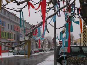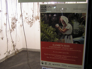 ![]() unter rot.....todo el día ya sabemos, el día zero siempre es así. Una extraña sensación de llegar al límite sin estar completamente preparada...sabiendo que se está. Pánico escénico, pues. Y este escenario es especialmente rudo. Un público tan distinto, tan "otro", tan inmerso en las corrientes del mainstream. Me interesa muchísimo la reacción, la respuesta de gente como el curador Hartwig. Poner mi trabajo sobre esta mesa es sumamente importante, porque aunque no es niuyork, es el lugar de Klimt y Hundertwasser, de Freud y Egon Schiele, por quedarme ahí. (En estos días inauguran una expo del maestro Escher y después los prerafaelitas tendrán su espacio, por ejemplo. Krems es Europa, dí). Creo en mi trabajo, en mi obra, que es una visión alter-nativa, estético/política, una -mi- identidad manifestándose en el mundo, y sé además que hay expectativas sobre qué es lo que voy a presentar después de dos meses. Eso por un lado. Por el otro, mi preocupación social y efectiva, que el objetivo político llegue a su punto. Como el merengue. Que pueda ser inteligible el mensaje, y más, que toque las entrañas y las haga hervir. la acción ritual en el árbol de castañas frente a la puerta de la almoloya austriaca fue un éxito, ya que la gente participó gustosa y fue más allá de lo sugerido, entusiasmada. El árbol quedó tupido de tiras de tela de colores. Cada una representando la vida arrancada de las mujeres que vuela, baila con el viento, abrazada al árbol que vuelve también a la vida, con al fuerza de la primavera. Perséfone saliendo del inframundo para saludar al sol, para decir aquí estoy y soy tú, la que sonríe.