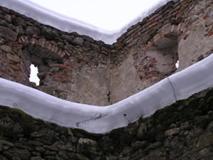 Nieva otra vez. NO esa nieve ligera como llovizna, sino que ahora cubre las superficies fácilmente. Es como una despedida. Mi árbol de la vida, meine Lebenbaum, recoge también la nieve en sus bandas de colores. Me visto y bajo a tomar fotos. Es algo parecido a lo que había pensado en un principio, un árbol en medio de la nieve. Los colores agitándose en el viento. Ok, no está en medio de la nada, del desierto blanco, pero si está en una isla blanca frente a la prisión más pesada de Austria. Stein, Roca.