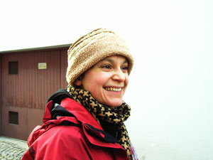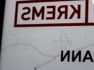 y para el balance más que necesario, las pláticas con mis vecinos del 23, Goh Lee Kuang y Lau Mun Leng, artistas multimedia de Malasia de trabajo muy interesante (pienso en identidades 07). Ella, Mun Leng, me invitó a participar en su nuevo proyecto Una hora caminando, que empezó en Berlín. A las 4 salimos rumbo a Stein, subimos la mitad de la colina escalonada por los weingarten, los viñedos, sin decir una palabra y en fila india, unas veces guiando ella y otras yo. Pegué el primer cartel en esta ciudad y registramos puntos y escenas que nos llamaron la atención. Estoy dispuesta a hacer esta caminata diaria con ella, ya que de por si camino todos los días. Veré mis reacciones al caminar acompañada pero sin poder hacer comentarios. Registraré mis pasos de una nueva manera, más dirigida. Haré mi propio mapa visual de este lugar. A partir de hoy ese registro estará en este web, se llama Pata de perro y para llegar a él solo hará falta hacer click en la siguiente huella de perro, de esos que pululan atados a sus amos y llenan las calles de cacas: Ella es Mun Leng: y durante la caminata tomó las siguientes imágenes: