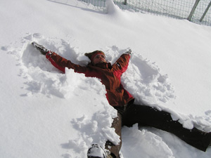 Pero a medio día sale el sol y nosotras a caminar. Después de la hora de silencio a lo largo del río Limmatz, una luz muy brillante, un paisaje nunca visto -ni por mi ni por S- pasamos por un campo de futbol y S me enseña como hacer una ángela de nieve.... En casa hacemos la Talk piece, que luego subiré en su sitio adecuado, que aún no existe