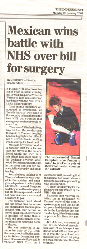 Lo nuevo: si, la experiencia de la discapacidad por una fractura sucedida en Londres. Mi curiosidad y unos zapatos de la diseñadora Vivienne Westwood (mala para diseñar zapatos ella), me lanzaron hacia una muy diferente perspectiva de la vida. Una operación, titanio en la tibia, cuatro tornillos, 10 días con la vista del Támesis y el Parlamento desde el 11° piso del St. Thomas, no me detuvieron. La BBC transmitió una entrevista en vivo y, con los testimonios en mi maleta, continué con mi gira. |