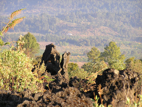 In a piece of land belonging to San Juan Paricutirimicuaro or San Juan de las Colchas, the youngest american vulcano was born at 17,30 on February 20, 1943: the Paricutin. This caused displacement to several people towns, but no deaths. With its aggressive and amazing landscape, formed by lava and vulcanic sand intertwined with pine forests, has been a subject for art since the beginning. Many still living people watched the performance of its developement, among them, my mom. |