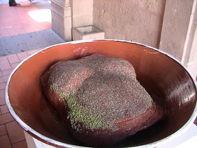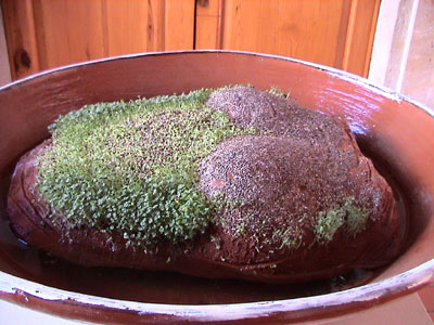 Agua Viva y Agua Nuestra estuvieron a la vista del público en dos salas del Centro Cultural Universitario en el Centro histórico de Morelia el mes de enero del 2004. Durante ese tiempo, las semillas "sembradas" en ritual fructificaron en el pectoral de barro húmedo. (La cazuela es de Capula y funcionó como el enlace entre las dos salas). Living Water and Our Water were shown in two rooms of the Centro Cultural Universitario in Morelia during January 2004 where I performed a ritual planting seeds on the clay island breast, linking the two rooms. The seeds grew up along the exhibit. |