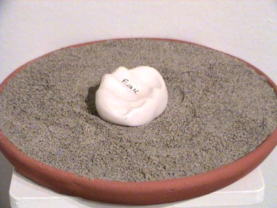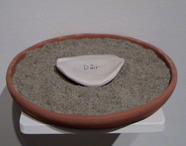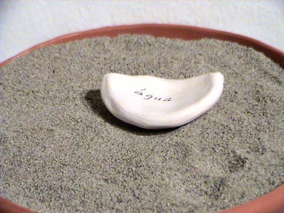 25 piezas: plato de barro, arena de mar y cerámica bruñida con la palabra AGUA escrita en 25 idiomas distintos.