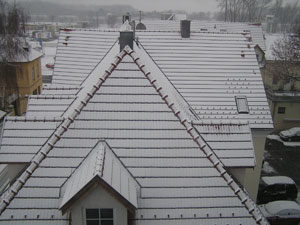 Nieva otra vez. NO esa nieve ligera como llovizna, sino que ahora cubre las superficies fácilmente. Es como una despedida. Mi árbol de la vida, meine Lebenbaum, recoge también la nieve en sus bandas de colores. Me visto y bajo a tomar fotos. Es algo parecido a lo que había pensado en un principio, un árbol en medio de la nieve. Los colores agitándose en el viento. Ok, no está en medio de la nada, del desierto blanco, pero si está en una isla blanca frente a la prisión más pesada de Austria. Stein, Roca.
