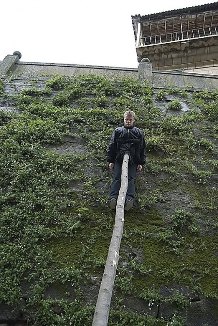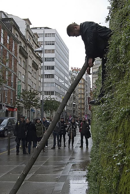 earth crammed on a stake placed at a right angle, performing