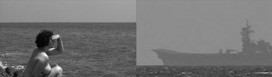 The interpretation of outsider can be read as the juxtaposition between a topless woman on a beach and the Armed Forces. The performer looks towards the Armed Forces as if stranded on a island. Should she call for help? Where exactly is she?