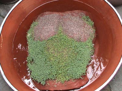 Agua Viva y Agua Nuestra estuvieron a la vista del público en dos salas del Centro Cultural Universitario en el Centro histórico de Morelia el mes de enero del 2004. Durante ese tiempo, las semillas "sembradas" en ritual fructificaron en el pectoral de barro húmedo. (La cazuela es de Capula y funcionó como el enlace entre las dos salas). Living Water and Our Water were shown in two rooms of the Centro Cultural Universitario in Morelia during January 2004 where I performed a ritual planting seeds on the clay island breast, linking the two rooms. The seeds grew up along the exhibit. |